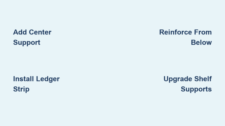 Cut a 1×3 pine board to match your cabinet’s interior height (minus 1/16 inch for clearance). Position it vertically at the exact center of the cabinet, front-to-back. Drill pilot holes through the cabinet sides into the support ends, then secure with 2½-inch construction screws and wood glue. This transfers shelf weight directly downward, eliminating bowing. Pro Tip: Wrap the support in matching contact paper for invisibility.