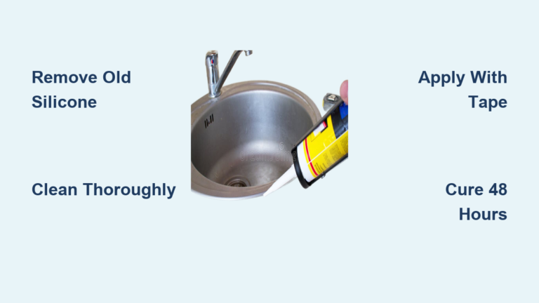 - Choose the Right Caulk: Must be 100% silicone labeled “kitchen/bathroom” (e.g., GE Advanced Silicone 2). Acrylic or latex will fail in 6 months.